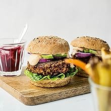 Buns aus Dinkelvollkornmehl, Patties mit Kidney-Bohnen, Karotten und Champignons. Dazu Brombeersenf – je nach Reifegrad scharf oder himmlisch fruchtig – und Fritten mit kräftiger Kräutermarinade. Der Burger liefert Eiweiß, Kalium und viele Vitamine. Purer Genuss für Ihne Weiblichkeit in der Zeit des Aufblühens.